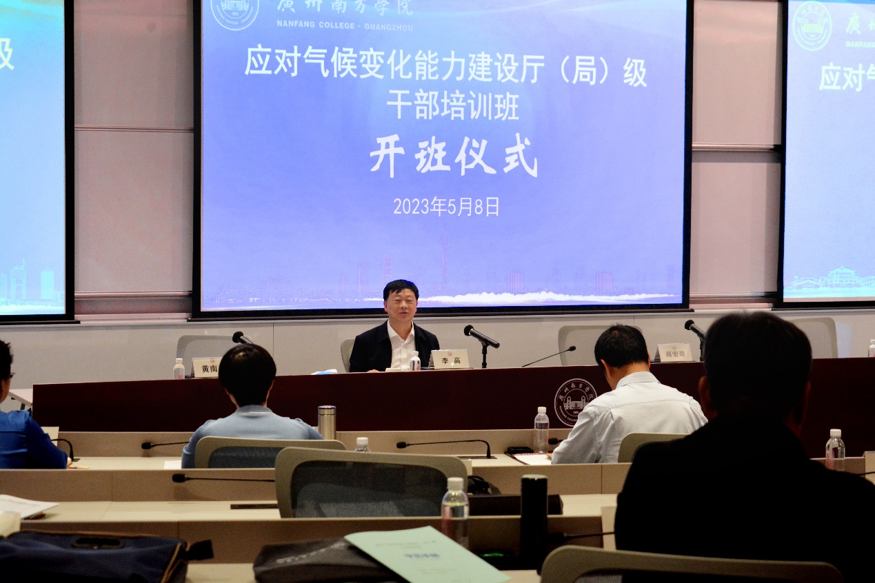 5月8日上午,生态环境部应对气候变化司李高司长、广东省生态环境厅蒋宏奇副厅长、广州南方学院黄南松副校长出席了开班仪式并致辞。应对气候变化司综合处丁辉处长主持了开班仪式。